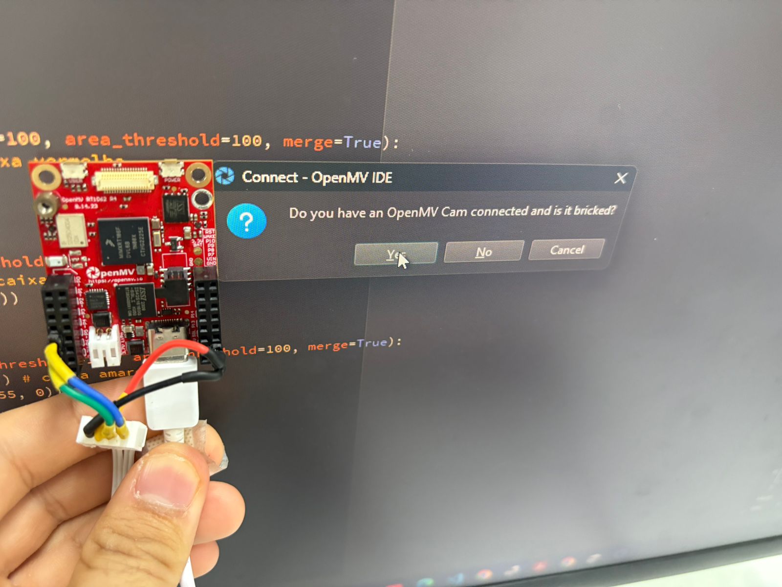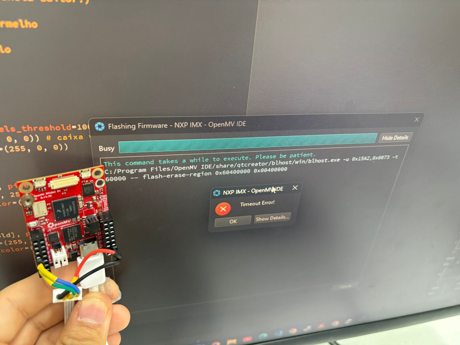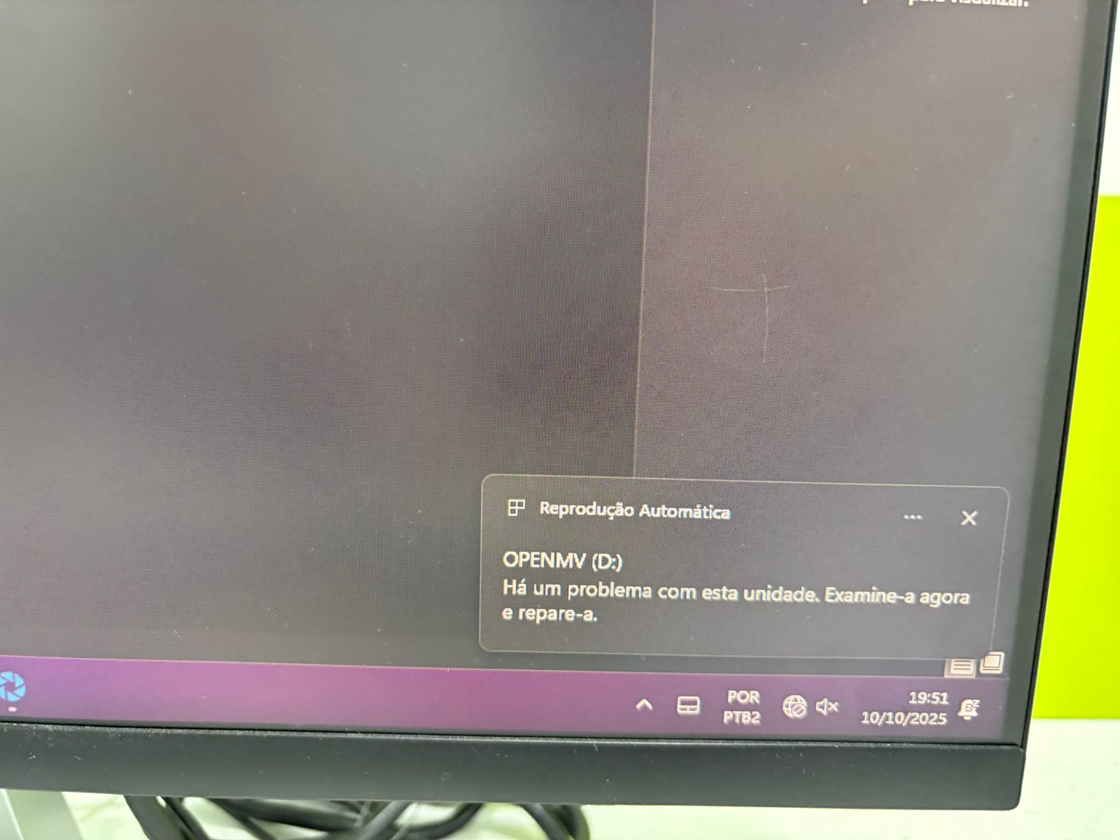 When I connect my OpenMV RT1062 camera via USB, the green LED always stays on and the blue LED flashes twice and then stays off for about 0.5 seconds, and during the 4th sequence of flashes of the blue LED the camera turns off and this error appears on my PC: Saying that there is an error in the unit, asking you to examine and fix it