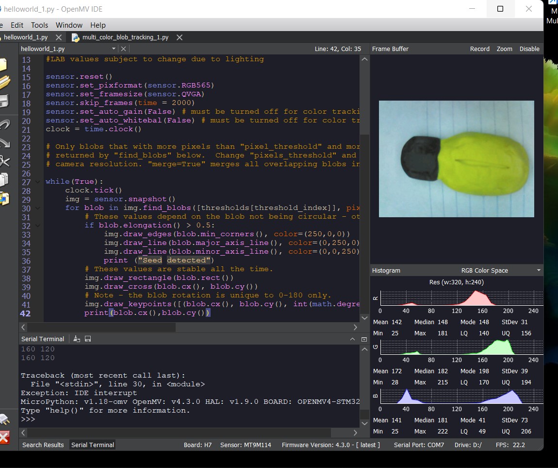 am working on a project and going in circles on how to write the code. I am using open MV H7 camera to determine if an object is in the correct orientation when passing under the camera. The object is fruit with a seed on the end and attached to the body of the fruit, so the size is not entirely consistent. The correct orientation for my purpose is seed first, or else it is a fail. How can I do this? I was thinking about comparing the areas of each using multiple color blob detection, to say the area of the first “color blob” (seed) that comes into frame must be smaller than the area of the second “color blob”(body) that comes into frame. Is it possible to do this? What functions can I use? Any other ideas? I am getting the idea that this is somewhat niche and I cannot find something relevant for comparison even. I am very new to coding. Thank you in advance.